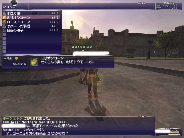 北サンドリアの広場の商人からセビリナへのおみやげにミリオンコーンを購入していきます。